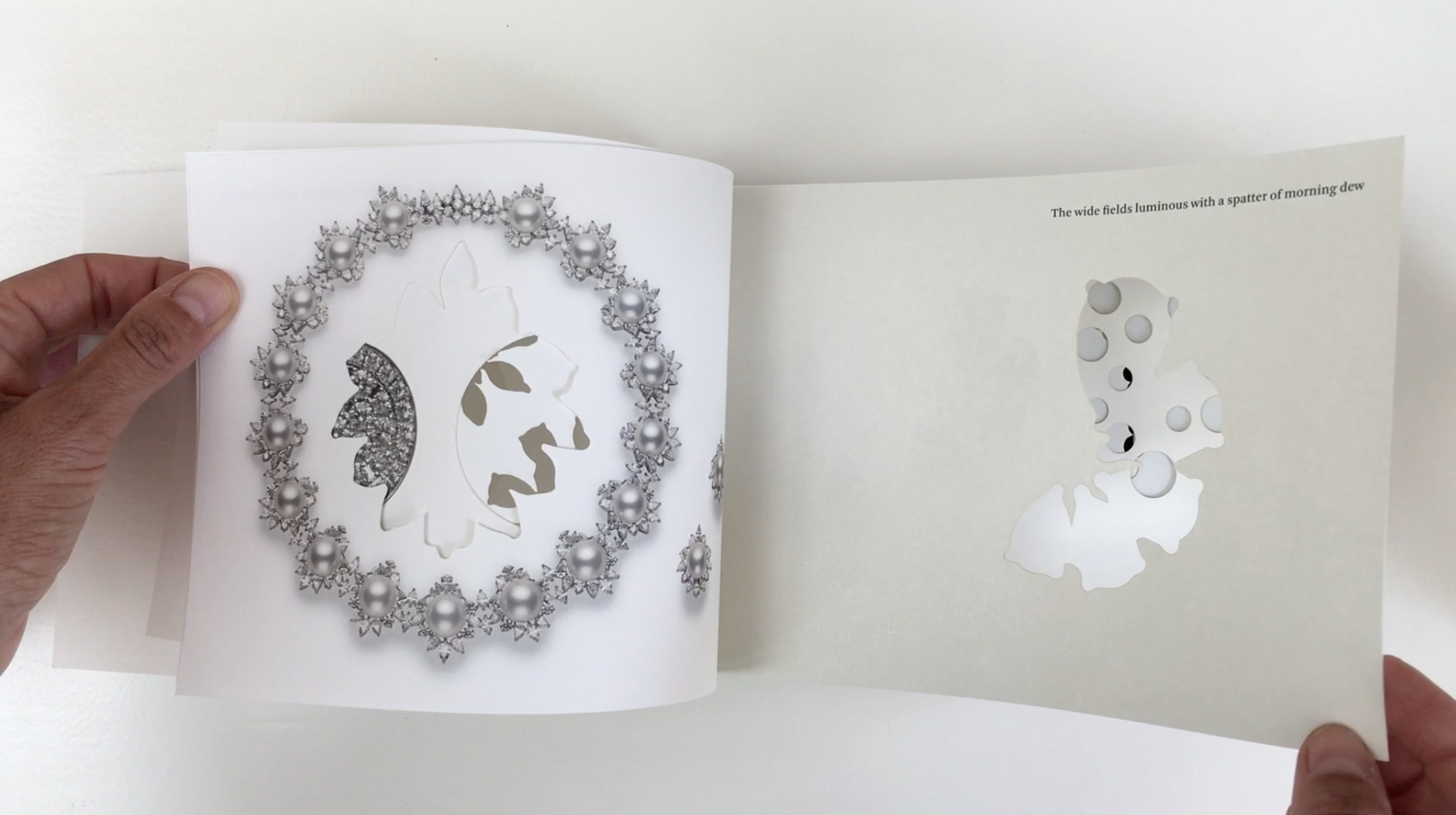 We developed a poetic narrative to accompany each product and to give it context. The texts set the reader up for the revealing of the jewelry piece on the following page. Each page incorporated a cut-out which related to the piece itself.
